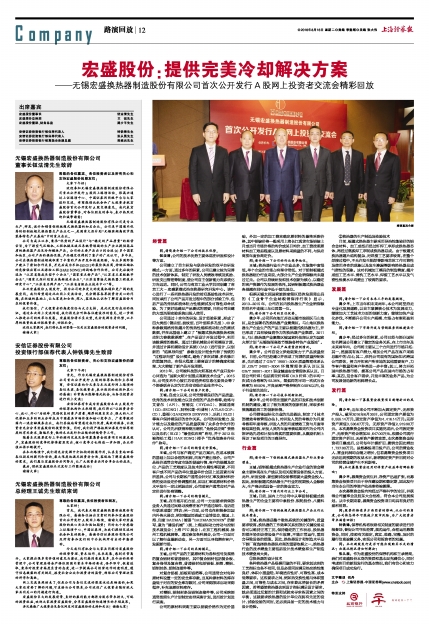 首先,我代表无锡宏盛换热器制造股份有限公司,感谢各位抽出宝贵时间参加宏盛股份首次公开发行A股网上路演,谢谢大家对宏盛股份的热心关注和热切期望!同时也十分感谢上证路演中心、中国证券网,为我们提供交流的机会和良好服务,感谢安信证券股份有限公司及所有参加发行的中介机构所付出的辛勤劳动。