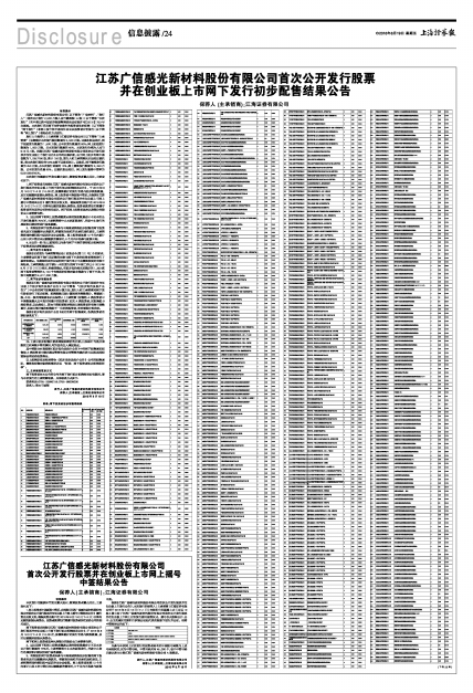 ■凡参与本次网上定价发行的投资者持有的申购配号尾数与上述号码相同的,则为中签号码。中签号码共有45,000个,每个中签号码只能认购500股江苏广信感光新材料股份有限公司A股股票。