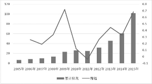 在商业银行表内信贷资产增长不足的双向夹击下,银行加大了票据贴现的力度,将票据资产向表内信贷转移。2005-2015年各家商业银行累计办理贴现业务量总体呈现增长态势,年均累计办理贴现业务增幅达到33.05%。