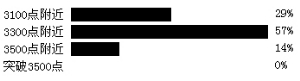 本次调查结果显示,有逾七成的首席策略分析师判断,2016年第四季度上证综指的波动区间上限在3300点附近及以上。其中,有57%的首席策略分析师判断,2016年第四季度上证综指波动区间的上限在3300点附近;有29%的首席策略分析师判断,2016年第四季度上证综指波动区间的上限在3100点附近;有14%的首席策略分析师判断,2016年第四季度上证综指波动区间的上限在3500点附近。