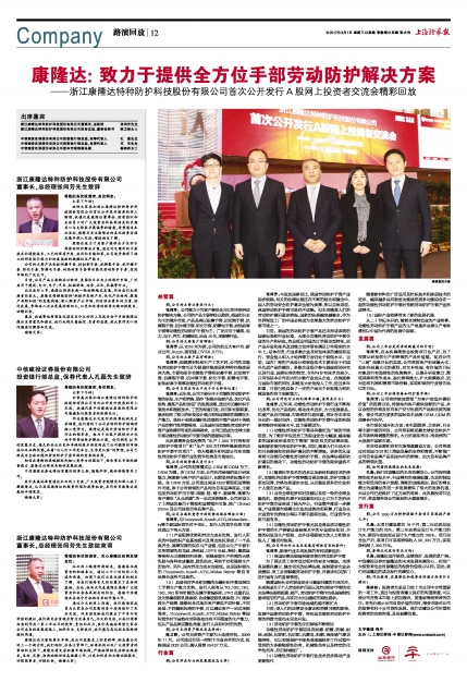 作为康隆达本次发行的保荐机构及主承销商,我们看到了公司在特种防护领域的核心竞争力。康隆达是国内劳动防护手套行业的领军者,致力于为客户提供全方位的手部劳动防护解决方案。公司拥有16年的发展历史,悠久的企业历史和卓越的技术积淀构成了公司稳固的市场地位及品牌优势。本着“让人们工作更安全、生活更从容”的梦想,公司已经成为全球功能性劳动防护手套市场的重要供应商。