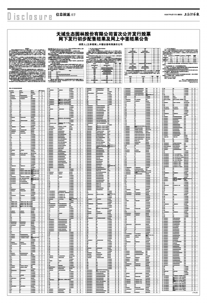 根据《天域生态园林股份有限公司首次公开发行股票发行公告》,发行人与保荐人(主承销商)于2017年3月16日(T+1日)上午在上海市浦东东方路778号紫金山大酒店四楼海棠厅主持了天域生态首次公开发行股票网上发行摇号中签仪式。摇号仪式按照公开、公平、公正的原则进行,摇号过程及结果已经上海市东方公证处公证。中签结果如下: