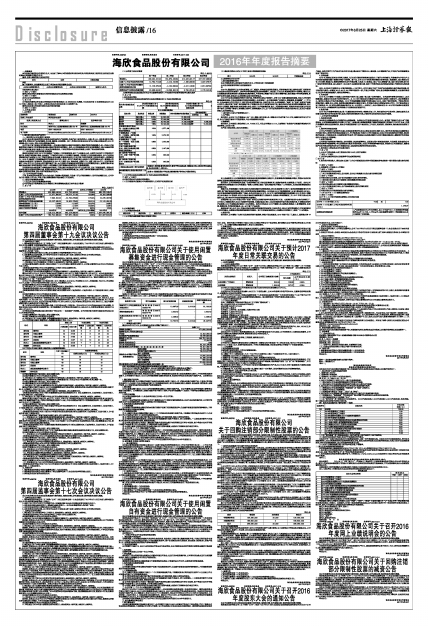 《海欣食品股份有限公司2016年度报告摘要》详见巨潮资讯网、《证券时报》、《证券日报》、《中国证券报》和《上海证券报》。