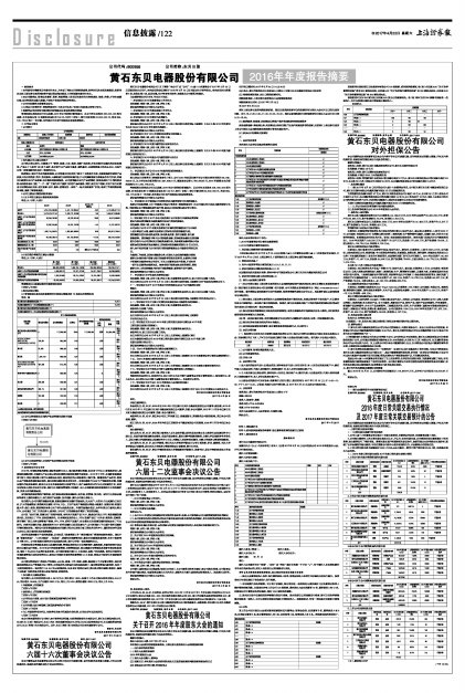 黄石东贝电器股份有限公司(以下简称“本公司”或“公司”)六届十六次董事会于2017年4月20日以现场表决方式召开。本次会议的会议通知于2016年4月10日以书面或电子邮件发出。本次会议应出席董事6名,实际出席6名,会议召集、召开符合有关法律、法规和《公司章程》的规定。