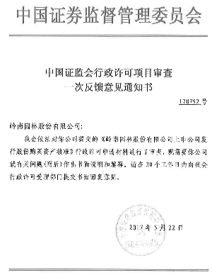 岭南园林股份有限公司(以下简称“公司”)于2017年5月23日收到中国证券监督管理委员会(以下简称“中国证监会”)出具的《中国证监会行政许可项目审查一次反馈意见通知书》(170792 号)。中国证监会依法对公司提交的《岭南园林股份有限公司上市公司发行股份购买资产核准》行政许可申请材料进行了审查,现需要公司就有关问题(附后)作出书面说明和解释,并在30个工作日内向中国证监会行政许可受理部门提交书面回复意见。