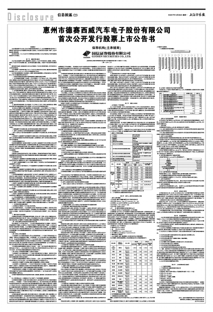 经深圳证券交易所《关于惠州市德赛西威汽车电子股份有限公司人民币普通股股票上市的通知》(深证上[2017]833号)同意,本公司发行的人民币普通股股票在深圳证券交易所上市,股票简称“德赛西威”,股票代码“002920”;其中本次发行的10,000万股股票将于2017年12月26日起上市交易。