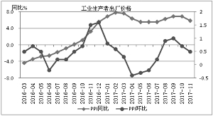 2017年以来,政府积极推进去产能,加之国际大宗商品价格上涨,带动煤炭、钢铁等工业品价格明显上涨。2017年1月至11月,工业生产者价格在波动中维持高位运行态势,PPI同比上涨6.4%,同比提高8.4个百分点。其中,生产资料价格上涨8.5%,约拉动PPI上涨6.2个百分点,生活资料价格上涨0.7%,约拉动PPI上涨0.2个百分点。此外,翘尾因素和新涨价因素分别为4.6%和1.8%。分行业看,煤炭开采业、石油和天然气开采业、黑色金属矿采选业、有色金属矿采选业同比涨幅分别为30.9%、30%、16.7%和14.2%,涨幅均超过10%,四个行业合计拉动PPI上涨1.8个百分点,贡献率约为28.1%。分月看,各月PPI同比涨幅均高于5.5%,月度最高涨幅达到7.8%,接近2000年以来的高点。2017年1月至11月PPI与CPI涨幅差分别为4.3、7.0、6.7、5.2、4.0、4.0、4.1、4.5、5.3、5.0和4.1个百分点,上下游价格涨幅差依然较大,对后期CPI上涨存在一定的传导压力。综合来看,初步预测2017年PPI上涨6.3%左右。