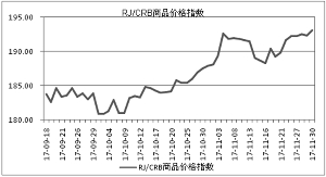 2017年以来欧盟、美国经济延续复苏态势,日本经济也有所好转,俄罗斯、印度经济走势以扩张为主。IFM预测2017年全球经济将增长3.6%,比2016年提升0.4个百分点,带动需求回暖,推升国际大宗商品价格。2017年1月至11月,大宗商品价格维持震荡上行的运行态势,RJ/CRB期货价格指数为183.7,同比上涨2.2%。从具体品种看,WTI原油期货价格为50.3美元/桶,同比上涨17.8%;LME铜铝期货价格分别为6055和1951.1美元/吨,同比分别上涨27.9%和22.9%。2017年前三季度,我国进口价格总体上涨10.6%,2016年同期为下降5.3%。我国主要进口大宗商品价格涨幅较大,2017年前11个月,我国进口铁矿砂价格上涨33%,原油上涨30.1%,未锻轧铜及铜材上涨29.5%。