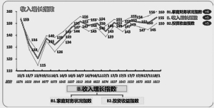 从本次财富景气指数的调查来看,资本市场对提升家庭财产性收入方面也起到了“助推器”的作用。本期小康家庭投资收益指数为150点。其中,预期投资收益指数为156点,比上期显著提升了6个百分点;现在投资收益指数为144点,也比上期有了5个百分点的提升。近期投资收益指数和预期投资收益指数之所以会上涨,主要是因为2017年末至2018年1月期间上证指数上涨显著,恒生指数震荡上升,黄金价格不断走高,人民币对美元汇率连续升值,使得小康家庭的投资收益显著增长。