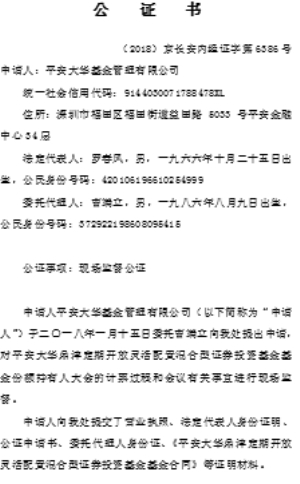 4、《北京市长安公证处关于平安大华鼎沣定期开放灵活配置混合型证券投资基金基金份额持有人大会的公证书》