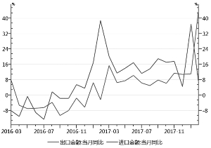 出口超预期增长。2018年2月,我国按美元计价的出口额同比增长44.5%,比1月大幅提高了33.4个百分点,创下2015年3月以来的最高增速。影响出口增长的主要因素包括,一是世界主要国家经济平稳运行带来稳定的外需。从我国主要出口国的经济景气状况来看,美国、欧盟和日本均表现出较好的复苏势头,这三大经济体制造业PMI均处于高位水平。二是低基数效应的影响显著。去年2月是2017年出口唯一负增长的月份 (-2.42%),当月出口额(1187.58亿美元)创下2014年3月以来最低。