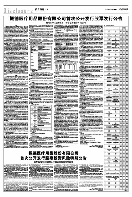 10、本公告仅对股票发行事宜扼要说明,不构成投资建议。投资者欲了解本次发行的详细情况,请仔细阅读2018年3月28日(T-1日)公告的《振德医疗用品股份有限公司首次公开发行股票招股说明书》。本次发行的招股说明书全文及相关备查文件可在上交所网站(www.sse.com.cn)查询。