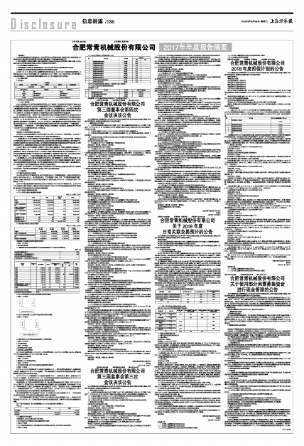 具体内容详见公司在指定信息披露网站上海证券交易所网站 (http://www.see.com.cn)披露的《合肥常青机械股份有限公司2017年年度报告及其摘要》,详见刊载于《中国证券报》、《上海证券报》、 《证券日报》、《证券时报》的《合肥常青机械股份有限公司2017年度报告及其摘要》。