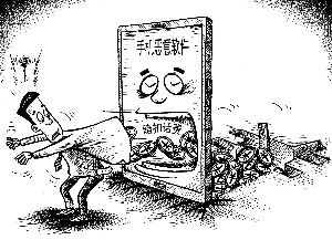 腾讯日前发布的《2018上半年互联网黑产研究报告》表明,伴随移动应用的影响力超过电脑应用,互联网黑色产业也迁移到了手机平台。上半年,手机病毒类型多达几十种,大部分属于资费消耗、恶意扣费和隐私获取三大类型。手机恶意软件每日暗扣话费超过千万。漫画 刘道伟