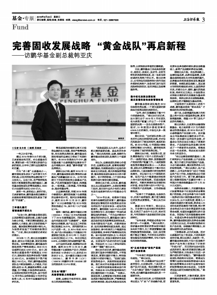 “过去三年,鹏华基金固收团队以风险管理为重要前提,以提升业绩为核心价值,不断完善制度建设,加强梯队人才建设,建立完备的固收产品线,整体固收管理规模不断壮大,为投资者创造了可持续的投资回报。”日前,韩亚庆在接受记者采访时表示。