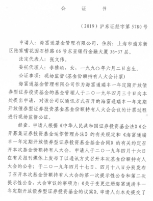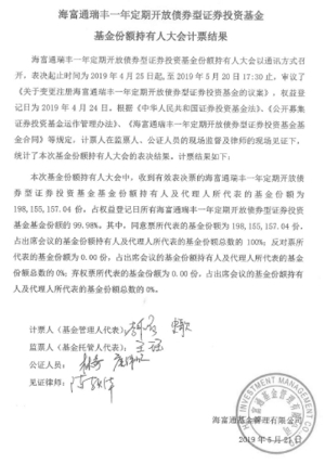 海富通基金管理有限公司(以下简称“本公司”)旗下海富通瑞丰一年定期开放债券型证券投资基金于2019年4月25日至2019年5月20日期间以通讯方式召开了基金份额持有人大会,会议表决于2019年5月20日17:30截止,会议期间审议了《关于变更注册海富通瑞丰一年定期开放债券型证券投资基金的议案》(以下简称“本次大会议案”)。
