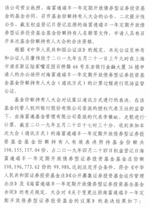 本次基金份额持有人大会中,收到有效表决票的海富通瑞丰一年定期开放债券型证券投资基金基金份额持有人及代理人所代表的基金份额为 198,155,157.04份,占权益登记日基金总份额(权益登记日为2019年4月24日,权益登记日本基金总份额198,196,773.62份)的99.98%,符合《中华人民共和国证券投资基金法》、《公开募集证券投资基金运作管理办法》和《海富通瑞丰一年定期开放债券型证券投资基金基金合同》有关持有人大会(通讯方式)的召开条件。其中,同意票所代表的基金份额为198,155,157.04份,占出席会议的基金份额持有人及代理人所代表的基金份额总数的100%;反对票所代表的基金份额为0.00份,占出席会议的基金份额持有人及代理人所代表的基金份额总数的0%;弃权票所代表的基金份额为0.00份,占出席会议的基金份额持有人及代理人所代表的基金份额总数的0%。经参加投票表决的基金份额持有人所持表决权的100%同意通过本次大会议案,符合《中华人民共和国证券投资基金法》、《公开募集证券投资基金运作管理办法》和《海富通瑞丰一年定期开放债券型证券投资基金基金合同》的有关规定,本次大会议案有效通过。