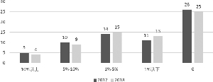 2018年有22家信托公司自营资产不良率下降,有20家公司自营资产不良率上。但是,除了2家公司,大部分公司自营资产不良率上升幅度很小,有10家公司在1个百分点以内。