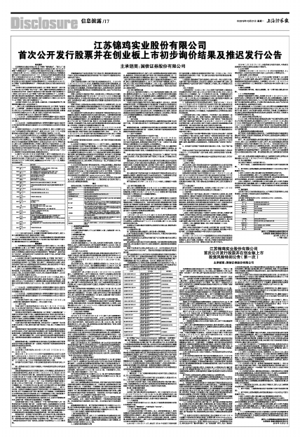 2、提请投资者关注发行价格与网下投资者报价之间存在的差异,网下投资者报价情况详见同日刊登于《中国证券报》、《证券时报》、《上海证券报》、《证券日报》上及巨潮资讯网(www.cninfo.com.cn)的《江苏锦鸡实业股份有限公司首次公开发行股票并在创业板上市初步询价结果及推迟发行公告》。