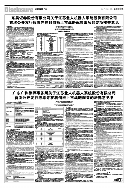 根据贵所颁布的《上海证券交易所科创板股票发行与承销实施办法》(上证发〔2019〕21号)(以下简称“《实施办法》”)、《上海证券交易所科创板股票发行与承销业务指引》(上证发〔2019〕46号)(以下简称“《业务指引》”),中国证券业协会(以下简称“证券业协会”)颁布的《科创板首次公开发行股票承销业务规范》(中证协发〔2019〕148号)(以下简称“《业务规范》”)等相关规定,东吴证券股份有限公司(以下简称“东吴证券”或“保荐机构”或“保荐机构(主承销商)”)作为江苏北人机器人系统股份有限公司(以下简称“江苏北人”、“发行人”或“公司”)申请首次公开发行股票并在科创板上市(以下简称“本次发行”)的保荐机构(主承销商),按法规要求对江苏北人本次发行引进战略投资者进行了核查。具体情况及保荐机构(主承销商)的专项核查意见如下: