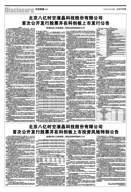 19、拟参与本次发行申购的投资者,请仔细阅读2019年12月17日(T-6日)刊登在上交所(www.sse.com.cn)的《北京八亿时空液晶科技股份有限公司首次公开发行股票并在科创板上市招股意向书》全文,特别是其中的“重大事项提示”和“风险因素”章节,充分了解发行人的各项风险因素,谨慎判断其经营状况及投资价值,并审慎做出投资决策。发行人受到政治、经济、行业及经营管理水平的影响,经营状况可能会发生变化,由此可能导致的投资风险应由投资者自行承担。