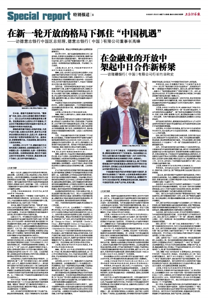 最近一年以来,金融业对外开放的步伐不断加快,成效卓著。从机构准入开放,到业务准入开放,再到市场开放,一系列举措相继落地,中国金融市场对外开放的格局更加全面和完整。在金融领域加快对外开放的进程中,境外金融机构如何契合中国经济高质量发展的需求,积极参与合作,实现共赢?日前,上证报专访了德意志银行中国区总经理、德意志银行(中国)有限公司董事长高峰。