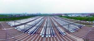 4月6日,武汉动车段高铁动车组整装待发(无人机照片)。武汉市将于4月8日起解除离汉离鄂通道管控措施。武汉铁路相关工作人员连日来忙碌在工作岗位上,为4月8日列车开行做准备。 新华社图