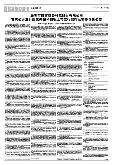17、本次股票发行后拟在科创板上市,该市场具有较高的投资风险。科创板公司具有研发投入大、经营风险高、业绩不稳定、退市风险高等特点,投资者面临较大的市场风险。投资者应充分了解科创板市场的投资风险及公司《深圳市财富趋势科技股份有限公司首次公开发行股票并在科创板上市招股意向书》(以下简称“《招股意向书》”)中披露的风险因素,审慎作出投资决定。