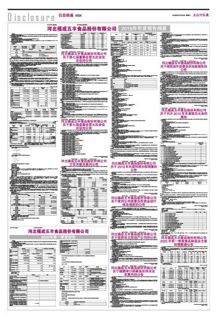 根据上海证券交易所《上市公司行业信息披露指引第二十四号-食品制造》及《关于做好上市公司2020年第一季度报告披露工作的通知》的要求,河北福成五丰食品股份有限公司现将2020年第一季度食品制造业主要经营数据披露如下: