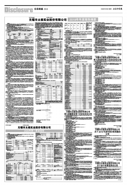 无锡市太极实业股份有限公司(以下简称“公司”) 第九届监事会第三次会议,于2020年4月17日以邮件方式发出通知,于2020年4月27日在公司会议室召开。本次会议由监事会主席黄士强先生主持,应到监事5名,实到5名。会议的召集和召开符合《公司法》、《公司章程》和其他相关法律法规的规定。