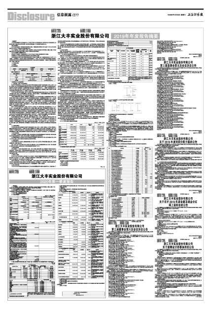 浙江大丰实业股份有限公司(以下简称“公司”)第三届董事会第六次会议于2020年4月27日在公司住所地会议室以通讯方式召开。会议应到董事9名,出席会议董事9名。本次会议的召集、召开及表决程序符合《公司法》、《公司章程》的规定,合法有效。