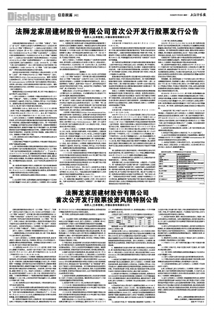 发行人与保荐人(主承销商)郑重提示广大投资者注意投资风险,理性投资,认真阅读本公告及同日刊登于《上海证券报》、《中国证券报》、《证券时报》和《证券日报》及上交所网站(www.sse.com.cn)的《法狮龙家居建材股份有限公司首次公开发行股票投资风险特别公告》。