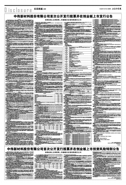 12、发行人和保荐机构(主承销商)郑重提示广大投资者注意投资风险,理性投资,请认真阅读2020年12月10日(T-1日)刊登在《中国证券报》《上海证券报》《证券时报》和《证券日报》上的《中伟新材料股份有限公司首次公开发行股票并在创业板上市投资风险特别公告》,充分了解市场风险,审慎参与本次新股发行。