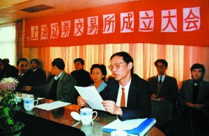 时任上海市市长朱镕基庄严地宣布“上海证券交易所开幕”,上海证券交易所理事长李祥瑞授权总经理尉文渊在交易大厅敲响正式开市的第一槌。
