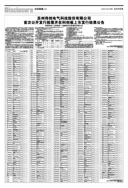 发行人和保荐机构(主承销商)依据《发行公告》,于2020年12月23日(T+3日)上午在上海市浦东新区东方路778号紫金山大酒店四楼会议室海棠厅主持了苏州伟创电气科技股份有限公司首次公开发行股票网下配售摇号抽签仪式。摇号仪式按照公开、公平、公正的原则进行,摇号过程及结果已经上海市东方公证处公证。