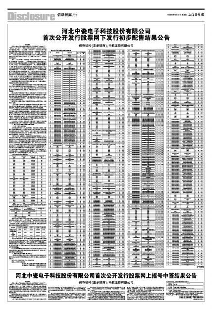 根据《河北中瓷电子科技股份有限公司首次公开发行股票初步询价及推介公告》(以下简称“《初步询价及推介公告》”)中公布的网下配售原则和计算方法,发行人和保荐机构(主承销商)对网下发行股份进行了初步配售,各类投资者的申购及初步配售结果汇总信息如下: