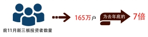 为活跃新三板交易,增加市场流动性,2019年末,新三板投资者适当性管理办法出台,新三板投资者资产门槛得以进一步降低,精选层、创新层、基础层的开户门槛分别降至账户前10个交易日日均资产100万元、150万元、200万元。今年以来投资者数量大幅增加,截至11月30日,新三板投资者数量达165万户,是去年底的7倍。