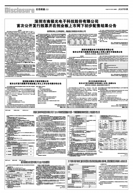 根据《深圳市南极光电子科技股份有限公司首次公开发行股票并在创业板上市发行公告》,发行人和保荐机构(主承销商)于2021年1月26日(T+1日)上午在深圳市罗湖区深南东路5045号深业中心308室主持了深圳市南极光电子科技股份有限公司首次公开发行股票中签摇号仪式。摇号仪式按照公开、公平、公正的原则在深圳市罗湖公证处代表的监督下进行并公证。现将中签结果公告如下: