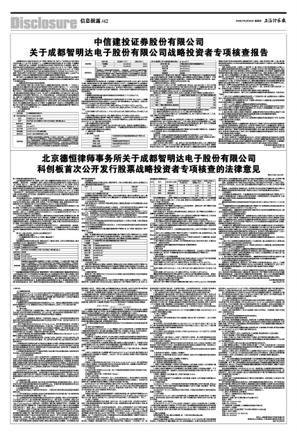 成都智明达电子股份有限公司(以下简称“智明达”或“发行人”)拟首次公开发行股票并在科创板上市(以下称“本次发行”)。中信建投证券股份有限公司(以下简称“中信建投证券”、“保荐机构”或“主承销商”)作为智明达本次发行的保荐机构(主承销商),根据《上海证券交易所科创板股票发行与承销实施办法》(上证发[2019]21号)(以下简称“《实施办法》”)、《上海证券交易所科创板股票发行与承销业务指引》(上证发[2019]46号)(以下简称“《业务指引》”)及《科创板首次公开发行股票承销业务规范》(中证协发[2019]148号)(以下简称“《业务规范》”)的相关规定,对智明达本次发行的战略投资者进行核查,出具如下专项核查报告,并委托北京德恒律师事务所对战略配售相关事项进行核查。