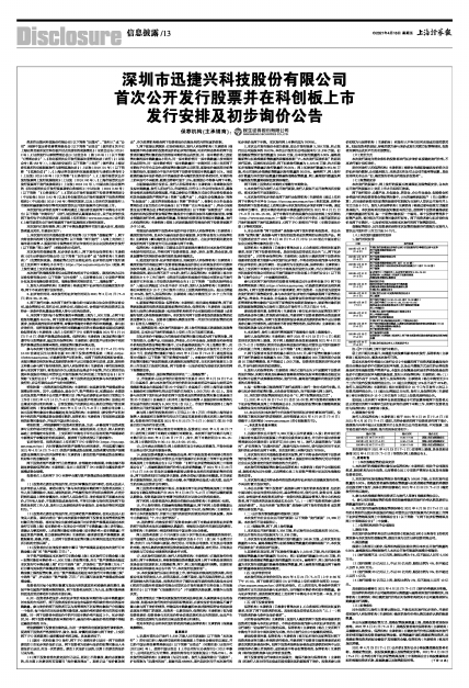 深圳市迅捷兴科技股份有限公司(以下简称“迅捷兴”、“发行人”或“公司”)根据中国证券监督管理委员会(以下简称“证监会”)颁布的《关于在上海证券交易所设立科创板并试点注册制的实施意见》(证监会公告〔2019〕2号)、《证券发行与承销管理办法》(证监会令〔第144号〕)(以下简称“《管理办法》”)、《科创板首次公开发行股票注册管理办法(试行)》(证监会令〔第153号〕),上海证券交易所(以下简称“上交所”)颁布的《上海证券交易所科创板股票发行与承销实施办法》(上证发〔2019〕21号)(以下简称“《实施办法》”)、《上海证券交易所科创板股票发行与承销业务指引》(上证发〔2019〕46号)(以下简称“《业务指引》”)、《上海市场首次公开发行股票网上发行实施细则》(上证发〔2018〕40号)、《上海市场首次公开发行股票网下发行实施细则》(上证发〔2018〕41号),中国证券业协会颁布的《科创板首次公开发行股票承销业务规范》(中证协发〔2019〕148号)(以下简称“《业务规范》”)、《首次公开发行股票网下投资者管理细则》(中证协发〔2018〕142号)以及《科创板首次公开发行股票网下投资者管理细则》(中证协发〔2019〕149号)等相关规定,以及上交所有关股票发行上市规则和最新操作指引等有关规定首次公开发行股票并在科创板上市。