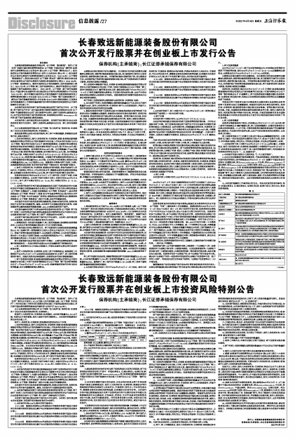 10、发行人和保荐机构(主承销商)郑重提示广大投资者注意投资风险,理性投资,请认真阅读2021年4月16日(T-1日)刊登在《中国证券报》、《上海证券报》、《证券时报》和《证券日报》上的《长春致远新能源装备股份有限公司首次公开发行股票并在创业板上市投资风险特别公告》,充分了解市场风险,审慎参与本次新股发行。