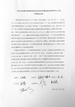 本基金以通讯方式召开了基金份额持有人大会,大会投票表决起止时间为自2021年3月24日起至2021年4月26日15:00止。2021年4月27日,在本基金的基金托管人浙商银行股份有限公司授权代表的监督下,本基金管理人对本次大会表决进行了计票,广东广信君达律师事务所对计票过程进行了见证,广东省广州市南方公证处对计票过程及结果进行了公证。经统计,参加本次基金份额持有人大会投票表决的基金份额持有人及代理人所代表的基金份额为3,967,297,582.58份,占权益登记日基金总份额3,978,344,660.01份的99.72%,达到法定开会条件,符合《中华人民共和国证券投资基金法》、《公开募集证券投资基金运作管理办法》和《广发汇佳定期开放债券型发起式证券投资基金基金合同》的有关规定。