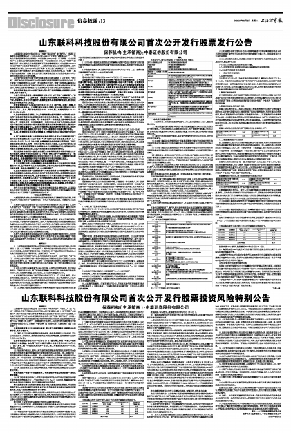 山东联科科技股份有限公司首次公开发行股票投资风险特别公告