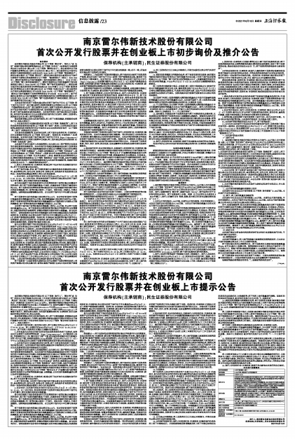 敬请投资者重点关注本次发行流程、网上网下申购及缴款、弃购股份处理等方面、并认真阅读进入刊登的《南京雷尔伟新技术股份有限公司首次公开发行股票并在创业板上市初步询价及推介公告》(以下简称“《初步询价及推介公告》”)。具体内容如下: