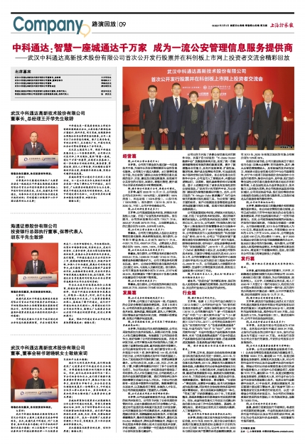 非常高兴今天能通过网络和广大投资者朋友一起就武汉中科通达高新技术股份有限公司首次公开发行股票并在科创板上市进行实时在线交流。在此,我谨代表中科通达,向参加本次交流活动的各位朋友表示热烈欢迎!同时感谢上证路演中心和中国证券网的大力支持!