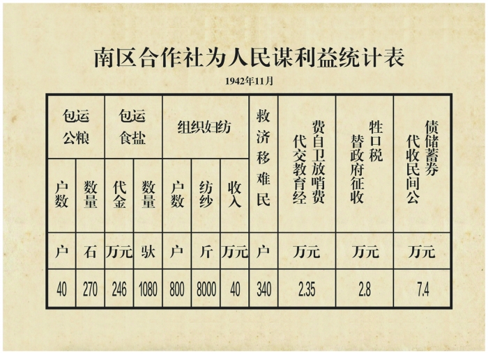 延安南区合作社创建于1936年,是党中央和毛泽东同志亲自培育和树立的合作社典范。截至1947年,已发展为拥有4.28亿元股金、18个分社、4000多名社员,经营供销、生产、消费、运输等多种业务的综合性合作社。毛泽东同志高度赞扬南区合作社,授予其“模范的合作社”锦旗,并号召全边区学习。