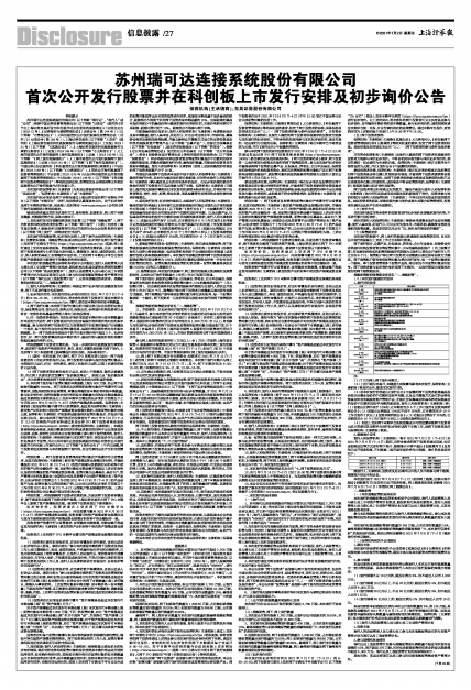 6、本次发行,发行人将进行管理层网下路演推介及网上路演推介。发行人及保荐机构(主承销商)将于2021年7月9日(T-1日)组织安排本次发行网上路演。关于网上路演的具体信息请参阅2021年7月8日(T-2日)刊登的《苏州瑞可达连接系统股份有限公司首次公开发行股票并在科创板上市网上路演公告》(以下简称“《网上路演公告》”)。