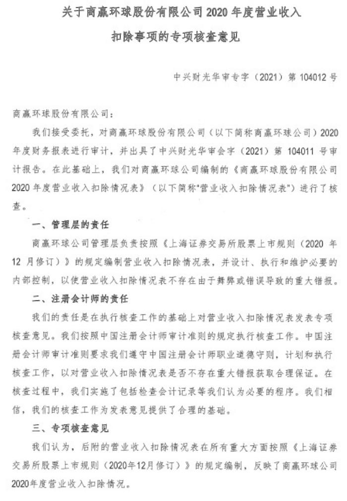 中兴财光华会计师事务所关于上海证券交易所《关于对商赢环球股份有限公司营业收入相关事项的问询函》相关问题的综合回复中说明“根据上海证券交易所发布的《关于落实退市新规中营业收入扣除相关事项的通知》,该业务虽与正常经营业务相关,但由于HIMALAYAS INC属于新增客户业务,可能影响报表使用者对公司持续经营能力和盈利能力做出正常判断,基于谨慎性考虑,我们对营业收入扣除情况的专项报告进行修订,将该部分营业收入予以扣除。”扣除 HIMALAYAS INC业务收入人民币7,088.33万元,营业收入扣除后金额为人民币3,745.71万元。归属于上市公司股东的净利润为人民币-41,116.39万元,归属 于上市公司股东的扣除非经常性损益的净利润为人民币-34,428.30万元,触及《上海证券交易所股票上市规则》(2020年12月修订)第13.3.2条等相关规定,公司继续实施退市风险警示。