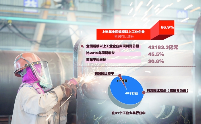 国家统计局昨日发布数据显示,上半年,全国规模以上工业企业利润同比增长66.9%,比2019年同期增长45.5%;两年平均增长20.6%,保持较快增长。