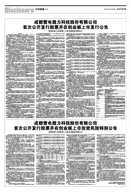 12、发行人和保荐机构(主承销商)郑重提示广大投资者注意投资风险,理性投资,认真阅读2021年8月12日(T-1日)刊登在《中国证券报》《上海证券报》《证券时报》及《证券日报》上的《成都雷电微力科技股份有限公司首次公开发行股票并在创业板上市投资风险特别公告》,充分了解市场风险,审慎参与本次新股发行。